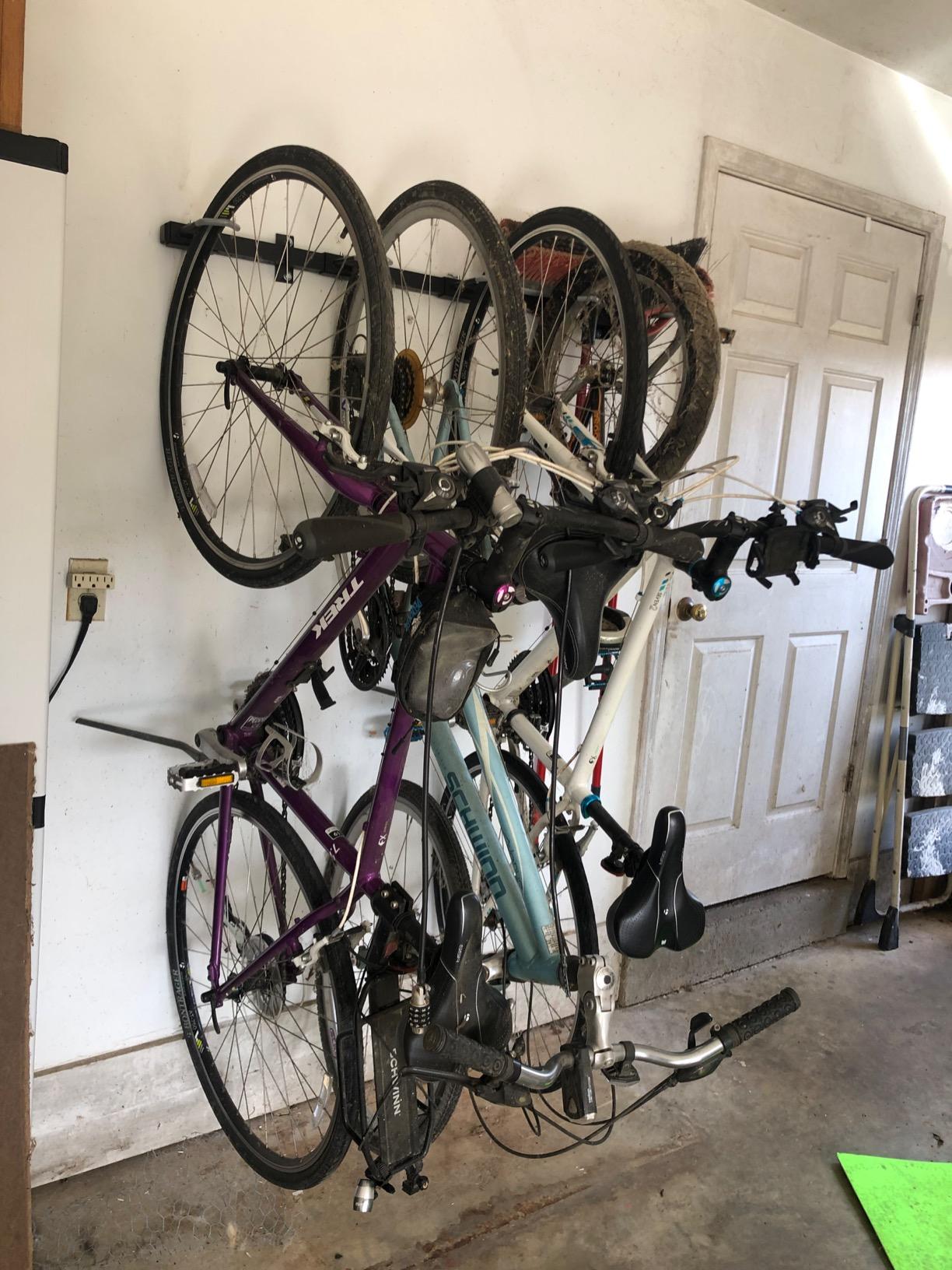 using it to hold up 4 bikes, width of studs in the garage made it harder to do 5 (luckily I really only need it to hold 4) – people complaining that it can’t hold more than 3 – you need to alternate hanging via front and back wheels to get the handlebars out of the way.