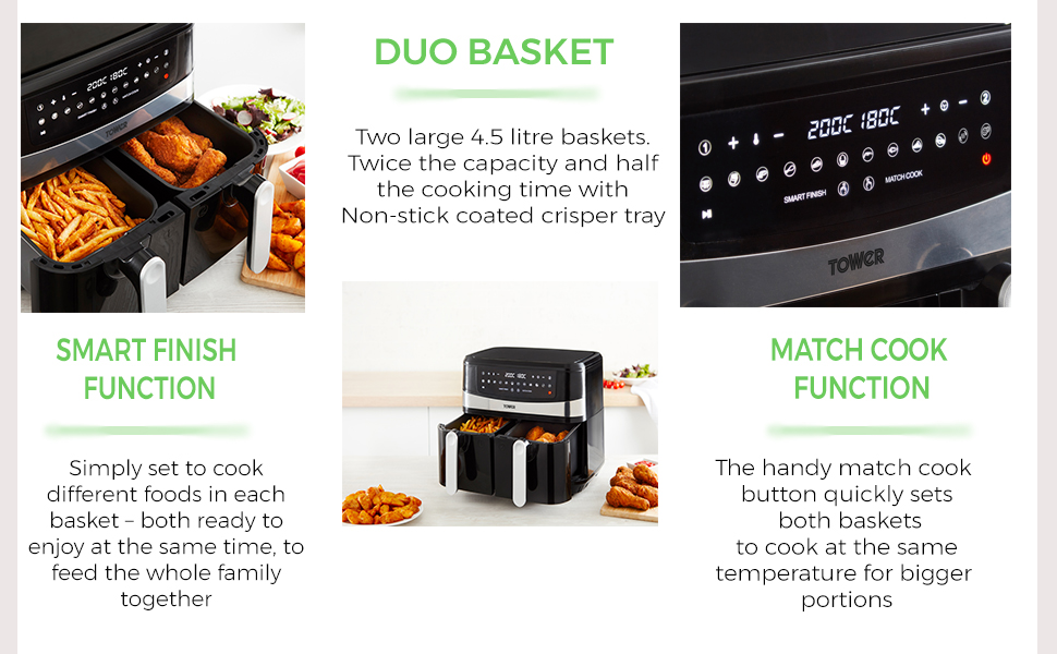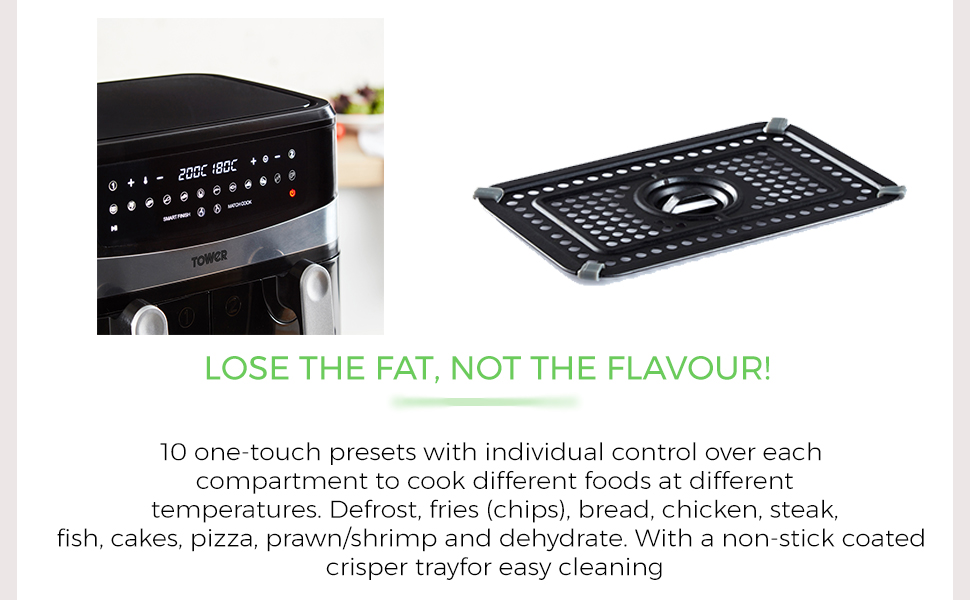Tower T17088 Vortx 9L Dual Basket Air Fryer with 10 One-Touch Presets, 1800W Power, Black