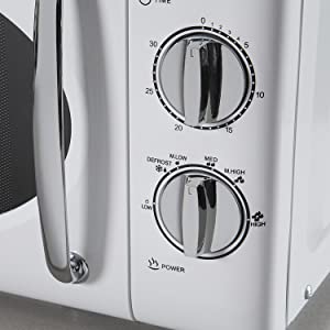 A very simple microwave to operate with mechanical timing knobs. Looks good and at a good price. Only one negative being the glass plate does move around a bit resulting in some vibration.