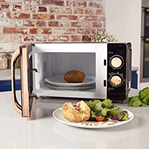 Packed with functionality surrounding elegant Rose Gold accents, this manual microwave is the perfect preparation tool for convenient cooking. Featuring five power levels and a defrost function you can tailor to a wide range of cooking requirements, with a 20 litre capacity that provides sufficient space to accommodate family size cooking. The 800W will cook, re-heat and defrost food in a matter of minutes, making this microwave a stylish and practical addition to any kitchen.