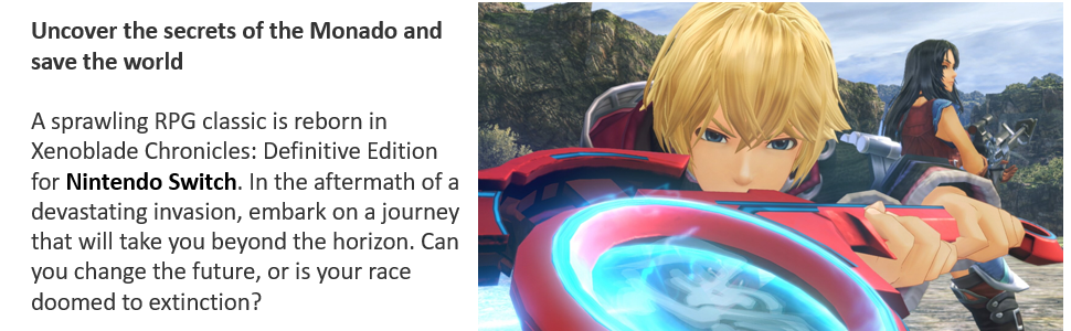 Xenoblade chronicles definitive edition has a captivating story with plenty twists and turns to keep players engaged which is accompanied by exiting gameplay which evolves as you progress through the story, the gameplay in the original 2010 wii game was more friendly to newcomers than its sequel from 2017 but still could be quite confusing for newcomers, this for the most part is fixed in definitive edition adding helpful explanations for mechanics and in battle an icon that says chance appears when you should use a move for optimal damage, this feature can be turned off for veteran players though. The music in the original game was fantastic and in definitive edition almost every track has been redone to an arguably better degree, another change is the most obvious compared to the original which is the graphics, in the original game the landscapes were beautiful especially for the hardware the game was using but On the wii some areas would load in things such as trees while walking through the area that is no longer a problem with the added bonus of every area in definitive edition looking stunning, also the great looking area’s in the original game came with A price That being the character models but as well as the graphics being upgraded the characters after ten years can finally show there emotion in the most serious cutscenes. My only complaint about definitive edition would be a few frame drops in the most compact areas.