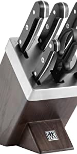 Twi knives have sharpener in stand which sharpens blades on removal and storing.