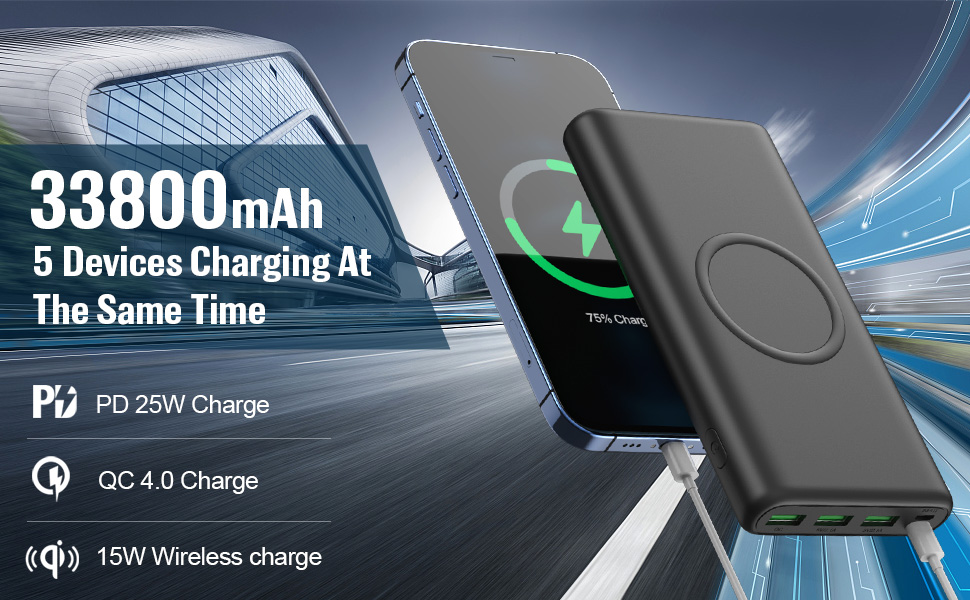 AUDIDH Wireless Power Bank, 33800mAh 15W Wireless Charging Portable Charger PD 25W QC 4.0 Fast Charging USB C Battery Pack with 5 Outputs Compatible with iPhone 13 12, Samsung, Huawei, Android etc