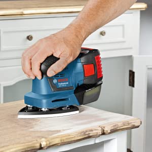 High-performance sandingYou can sand surfaces precisely and professionally with the cordless orbital sander GSS 18V-10. The battery technology also enables cordless and powerful working. With no load, the orbital sander delivers a speed of 11,000 rpm, and its orbit diameter measures 1.3 mm. | Flexible workingTo prepare tradespeople for multifaceted projects, the GSS 18V-10 Professional can be equipped with three different sanding plates. These are of different sizes and can be quickly and simply changed after use – for maximum flexibility when sanding. | Secure grip and various handle settingsSoftgrip coverings on the orbital sander grip provide comfortable and safe handling in any working stance. Together with the practical position of the on/off button, a variety of handle settings are possible during sanding with the GSS 18V-10. |