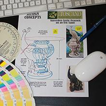 InspirationOur artist brought life and function to this historical depiction of a proud peacock. | Design ConceptsA design concept, detailing size, colour, and spirit, is created and sent to our sculptor. | Clay ModelsThe clay sculpt is approved at our factory. Casting and paint colour approval is next. | Finishing TouchesAfter safe packaging is established, we photograph our new table for advertising! |