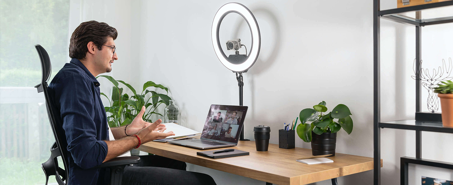 I’m using it for videoconferencing together with two Elgato Key Lights. The ring light is the new addition, and gives a more unifying lighting than only the two side lights (see the picture) – and makes wrinkles being less pronounced. 🙂
