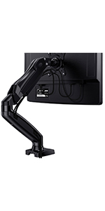 The monitor mount is designed with cable management clips on the arm and along the pillar to route wires for a cleaner, more streamlined look.