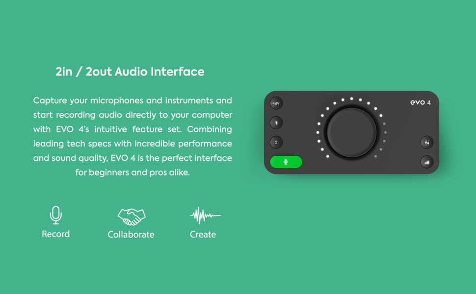 EVO 4 USB Audio Interface sound card for music production (2 in / 2 out USB audio-interface, 48 Volt phantom power, 2 microphone preamps, etc.)