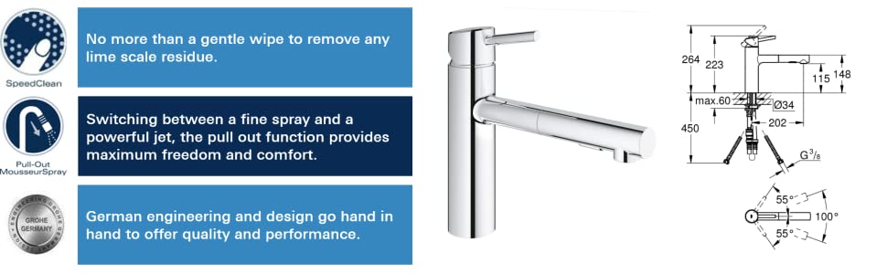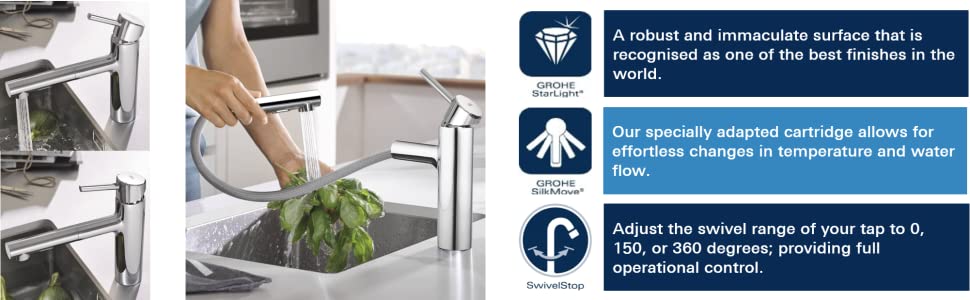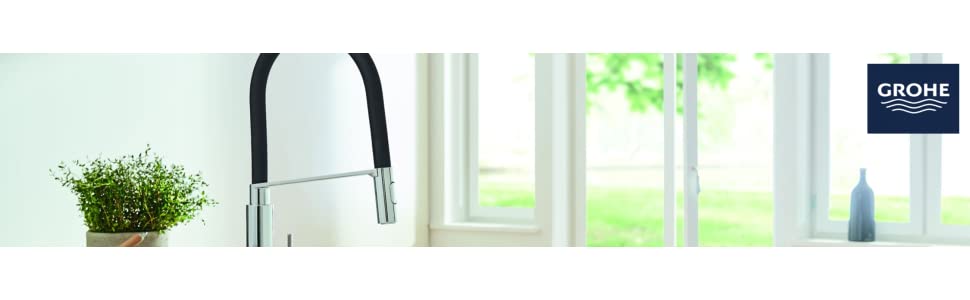 Robinet achet au dpart pour sa dimension, assez rare pour un modle avec douchette, permettant de l’installer sous une fentre. Produit esthetique et de qualit, matriaux et finition soigns, rapide et trs facile installer grce un schma fourni (serrage par le dessous, comme la grande majorit des robinets). J’avais 2 inquitudes en lisant les commentaires prcdents : 1) l’angle de rotation : Install sur un vier 2 bacs, l’angle suffit au final largement pour utiliser chacun des 2 cts. 2) La douchette en matire plastique : c’est mme plutt un atout car beaucoup moins lourd et fragile lorsqu’on l’chappe (ce qui arrivera invitablement!). De plus le revtement de la douchette est de qualit et tout est coloris inox brillant, y compris le raccord au flexible (contrairement de nombreuses autres marques ou c’est en plastique noir), ce qui donne un rendu trs qualitatif. Trs content de cet achat. S’il fallait un petit bmol je dirais le prix un peu lev, mais la qualit Grohe se paie!