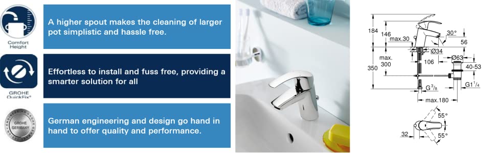 Great tap. I bought this to replace a dripping tap that came with the house and didn’t match the Grohe shower that I had installed a while ago. I had hoped that the water would end up being delivered slightly higher up than my previous tap, to facilitate filling the reservoir for my coffee machine. I should have checked the specification more carefully, as this tap delivers water closer to the basin than its predecessor – mea culpa. However, most UK users will find that adapters will be needed and these are of a size that isn’t particularly common. So if, like me, you hire a plumber to fit the taps you’ll end up with a larger bill whilst the plumber goes out to purchase the required adapters. Makes the taps less good value for money. I should have read the reviews more carefully (do I spot a trend!) as this problem has been encountered by others. But the message is really to Grohe – these adapters should be included for UK purchasers.