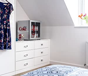 Featuring the Diet Coke logo on the glass door and the silver cabinet, this stylish Diet Coke branded drinks cooler is ideal for living rooms, bedrooms or the home office. With a reversible door, it makes access to your favourite drinks even easier. Simple to clean, it has a double glazed door and is compressor based for efficient chilling.