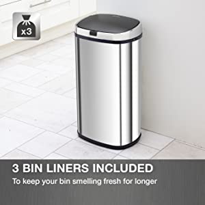 Good contact free bins, sensors work well to save having to manually touch the bin every time. Comes with a few free bags that are a tight fit but once on and pinned by the restrainer hold well.