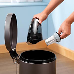 Also, it’s lightweight, easy to empty, and the mini clip-off vacuum is super for edges, stairs, and small areas.