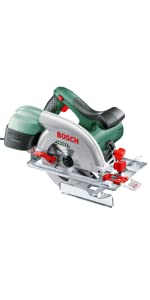 Effective and powerfulThe PKS 55 hand-held circular saw from Bosch has a powerful 1200 W motor. It therefore supports all common sawing applications with cutting depths of up to 55 mm in wood. | CutControl for clean cutsThanks to the easily visible base plate marking and a transparent, fold-out extension, the hand-held circular saw facilitates controlled freehand cuts. With standard and mitre cuts, the extension allows the cut line to be tracked very precisely. | Easy changing of the saw bladeThe PKS 55 hand-held circular saw has an integrated spindle lock. This makes changing the saw blade a quick and easy process. |