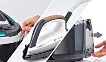 The iron unit is well shaped with a sharp pointed nose and rounded rear to facilitate crevices corners, and it will sit either on top of the steam boiler or on the ironing board using the detachable base plate which comes off of the boiler to allow it to be placed on the ironing board. The boiler unit is small enough to enable it to sit on the ironing board but I prefer it on the floor with the iron placed on the board for ease of use.