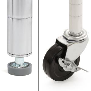 Restaurant quality storage shelves that have a clean look but are very sturdy. This item is easy to assemble and the wheels make it convenient and safe to move, for example clean behind and around the area.