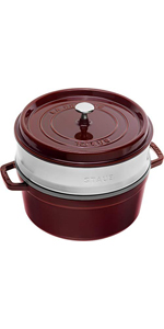 The flat lid developed by STAUB has a special moisture-retaining interior, ensuring continuous and natural basting of food as it cooks. Condensed moisture simply collects on the sides of curved lids, with STAUB’s flat lid, it drips down for even distribution. The effect is enhanced by placing ice cubes on the lid.