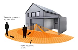 Human thermal radiationDue to their body heat humans emit infrared radiation. Infrared sensor technology uses this radiation to detect movement and to react accordingly. | The pyro sensorThis electric module reacts as soon as the infrared thermal radiation within the detection zone changes. This causes a voltage jump which is then converted into an electronic impulse, which switches the light on or off. | ReachThe reach of infrared sensors depends on the direction of movement. With tangential movements (parallel to the sensor) the reach is about 12 m on average, which is shortened when moving directly towards the sensor (radial movement). By turning the multilense the sensor’s reach can be adjusted to either 5 or 12 m. The 180° detection zone can be limited with the included lens covers. To attain the maximum reach the optimal mounting height of 2 m should be given. |