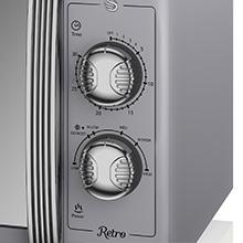 Five Power LevelsThanks to the 5 power levels and defrost setting, cooking delicious meals for the whole family will be made quick and easy for the time pressed cook. Whether you need to heat up leftovers from the night before or defrost bacon for your full English breakfast, you can easily select your desired setting and timer by using the manual knobs. | 25 Litre CapacityThe microwave boasts a generous 25 litre capacity, which is more than enough space to fit a standard sized dinner plate, allowing you to heat up a readily prepared meal. By using the lower heat setting you could also warm up dinner plates ahead of serving up dinner so your food stays nice and warm. The 270mm glass turntable makes the appliance easy to clean, taking away all the fuss out of food preparation. | Fabulously RetroSwan retro is an award-winning range of small and large appliances, as well as kitchen accessories and cookware. The Retro Manual Microwave is available in a host of stylish colours, including sky blue, delicate green, vibrant lime, rich red and traditional cream. There is a shade to suit all tastes. If you’re looking to make a design statement in your kitchen, the Retro Range is ideal for making an impact. | Defrost SettingForgot to take tonight’s dinner out of the freezer? There’s no need to go without, thanks to the defrost setting you can defrost your meal in minutes. The setting is also useful for defrosting ready-meals, frozen ingredients for that midweek stir fry and bread for your morning toast. The cooking end signal will notify you when your food is ready too. |