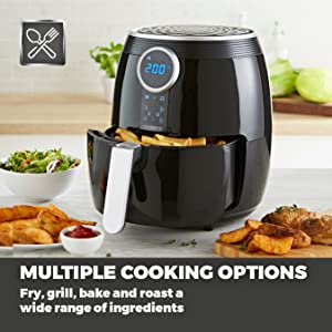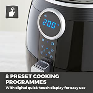 MULTIPLE COOKING OPTIONSThis air fryer oven lets you fry, grill, bake and roast, for the ultimate cooking companion | 60-MINUTE TIMERQuickly schedule the air fryer’s cooking cycle so your food is ready for you in no time after a long day | 8 PRESET COOKING PROGRAMMESFeatures a quick-touch digital display, letting you cook ingredients, including chicken, chips, fish, pizza and cake at the touch of a button |
