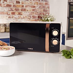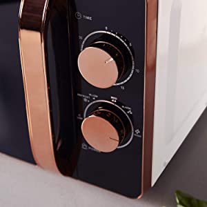 Packed with functionality surrounding elegant Rose Gold accents, this manual microwave is the perfect preparation tool for convenient cooking. Featuring five power levels and a defrost function you can tailor to a wide range of cooking requirements, with a 20 litre capacity that provides sufficient space to accommodate family size cooking. The 800W will cook, re-heat and defrost food in a matter of minutes, making this microwave a stylish and practical addition to any kitchen.