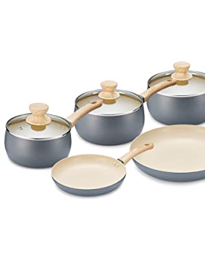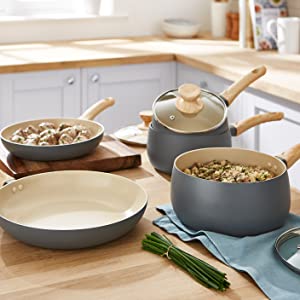 These are a very stylish set of pans which look great in the kitchen in my flat. The wood effect handles look good and a comfortable to hold. The grey colour and light interior work well together and they look and behave like a quality set of pans and I have no hesitation in recommending them.