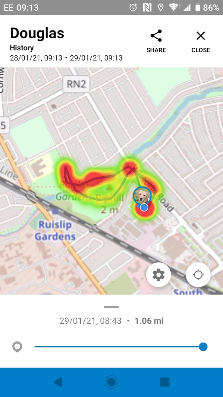 I have elected to keep live tracking on for the entire duration of our off lead walks. It is a shame that the maximum you can set live tracking to remain on for is just 60 minutes and it would be an improvement if the user had the option to simply leave it turned on.