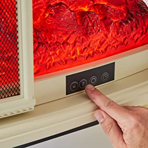 - Large panoramic window display opens to easily adjust heat settings and flame dimmer