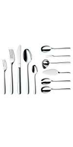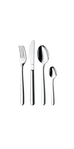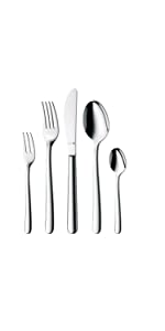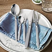 Forged knives.The blades are made of stainless steel and are forged from one piece and hardened throughout. The hardening process ensures good cutting properties and makes it corrosion resistant. | Cromargan protectThe novel material finish makes our cutlery extremely resistant to scratches and signs of wear. Polished surfaces remain shiny, matte surfaces remain matte. The cutlery looks almost as good as new even after years. | Rustproof and dishwasher-safe.WMF cutlery is very easy to clean and unlike conventional cutlery, dishwasher safe according to RAL-RG 604. This seal of approval may only bear cutlery that has undergone a uniform, standardised test procedure and have survived 1000 washes without damage. | Service programCutlery models that are out of current range can be purchased for a period of time. The cutlery will be reproduced for a period of time. This applies until the final expiration date announced at least one year before. |