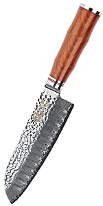 YOUSUNLONG Santoku Knives 7 inch Chef’s Knives Japanese VG10 Hammered Damascus Steel Natural Ebony Wooden Handle with Leather Sheath