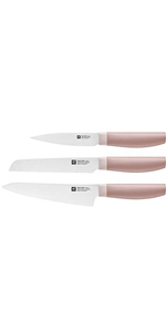 With the serrated knife you can easily and accurately cut fresh bread, including the crust, into smooth slices. The meat knife is ideal for cutting and carving meat of all kinds. Meat and fish as well as vegetables and fruit can be cut effortlessly with the chef’s and universal knife. The garnishing knife is suitable for all fine work.