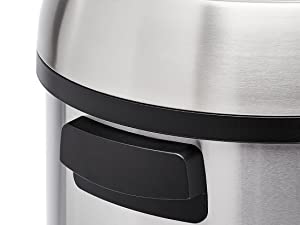 I do like its size tho. It’s tall enough to be useful and uses those 13 gal trash bags. The chrome look updates the kitchen and makes it look nice. If you want odor control, get those scented trash bags. And speaking of bags, they’re easy to put in and take out. Just lift the lid and the piece that fits on to hold the bag in place.