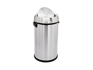 This stainless steel trashcan has a swing lid that opens with a touch. It is substantial in weight and won’t tip over too easily. Quality seems to be very good.