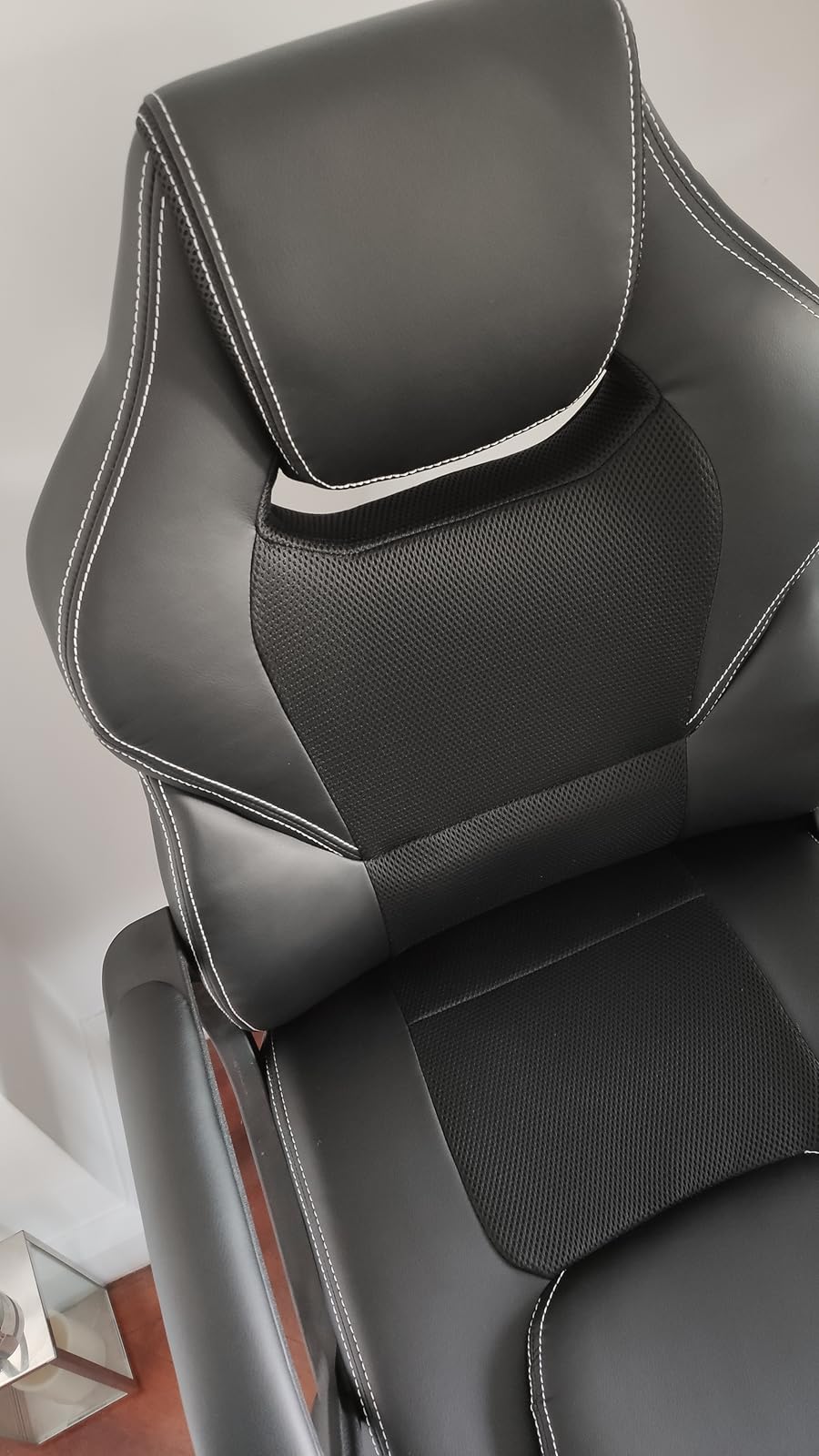 The BASETBL Office Desk Chair is a nice looking chair at an affordable price. The two tone PU leather and fabric design looks great, the white stitching looks classy and the padded armrests are brilliant for comfort.