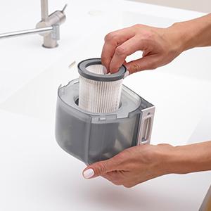 The dirt is collected in a translucent dirt bowl, that once full, can be removed at the push of a button and the dirt is disposed of without the need to touch it. Both the bowl and filters are washable.