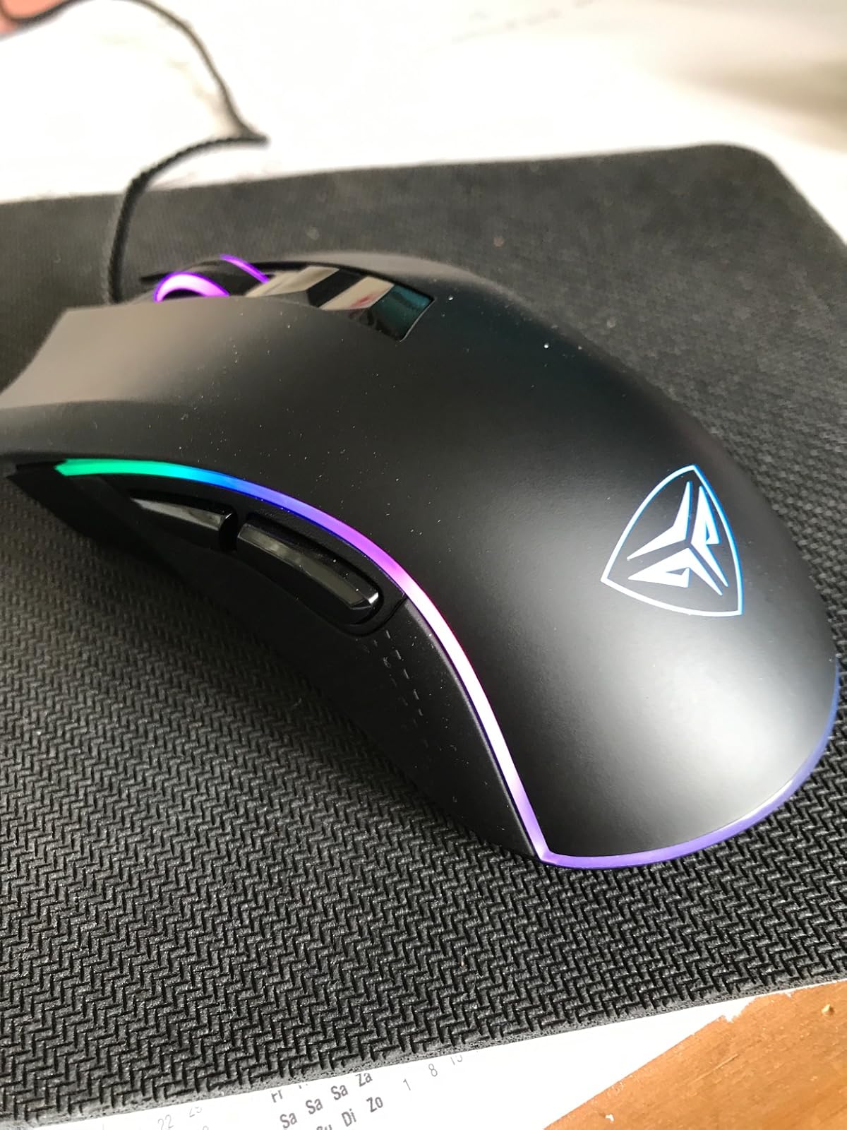 A high DPI gaming mouse, this device is a pretty good deal for the price. It arrived in decent enough packaging. The title for the box has a rainbow shimmer on the font to give off a ‘gamer’ feel to it.