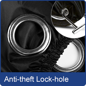 It had survived all weather from heat, snow, heavy downpours, and protects my bike completely. It had two hooks to clip under the bike to keep it from flying away and also two metal clip holes, which I use to thread a metal chain in and through the wheel.