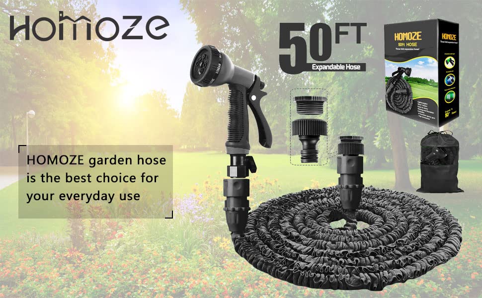 HOMOZE 50ft Expandable Garden Water Hose Pipe with 3/4″, 1/2″ Fittings, Anti-leakage – Flexible Expanding Hose with 8 Function Spray Nozzle (Black)