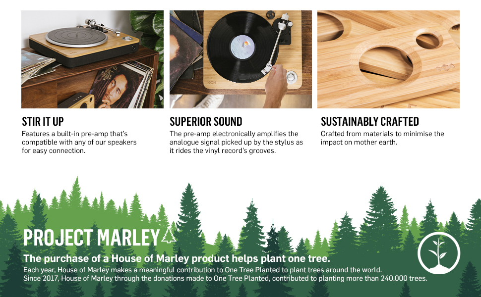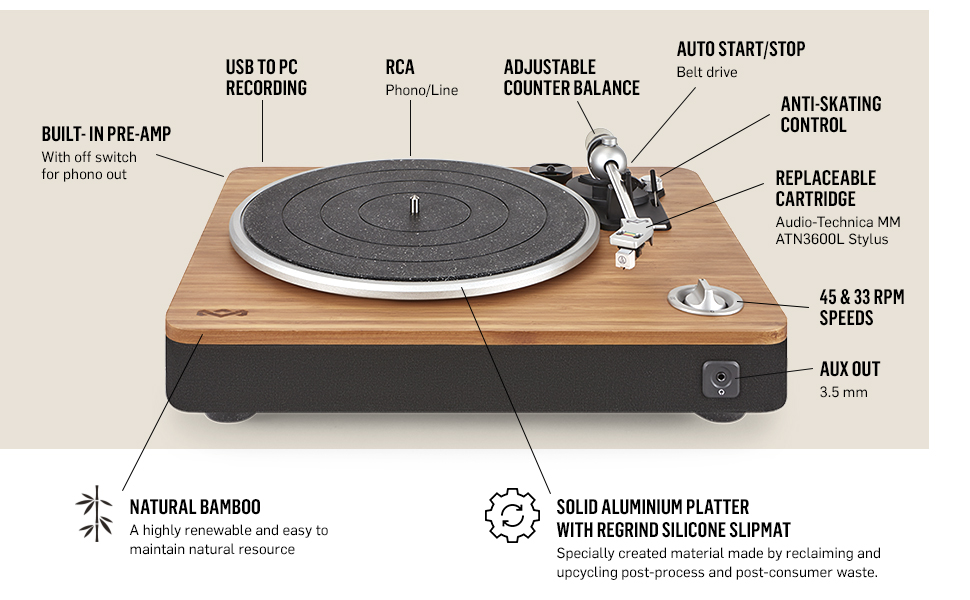 House of Marley Stir It Up Record Player â Vinyl Turntable, Stereo Pre-Amp, USB Port, Record LP to PC, 33 + 45 RPM, Anti-Skating, RCA Audio Out to 3.5mm Cable, Dust Cover Included, Bamboo/Black