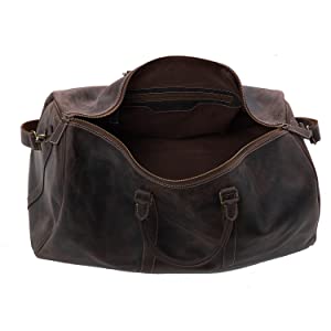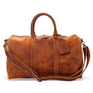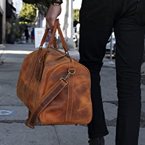 ROOMY INTERIOR COMPARTMENTIf you prefer duffel bags for traveling, then youâre certainly going to love our hand bag. Its roomy interior will fit your clothes, shoes, toiletry bag, gym attire, and even your laptop case and accessories. You can also store your wallet, keys and cards in its zippered pocket for safekeeping and easy reach. | ADJUSTABLE LEATHER STRAP FOR COMFORTABLE WEARForget travel bags for men and the sort of weekend bag for women that are a pain to carry. Our leather duffel features two ergonomic handles, and comes with an adjustable and removable strap with a shoulder pad, which make carrying it around a breeze! | QUALITY & SATISFACTIONWe take pride in the quality of our duffle bags and we promise you that it will get you through thousands of miles of travel, for many years to come. |