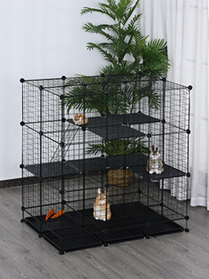 Great cage for our 3 rabbits! Basically a cheap c&c cage, we built it 2 x 4 grids in size and 2 tiers high by combining 2 sets. As a security measure we cable tied them grids together once assembled, but to be honest I don’t think we needed to! Great sturdy cage, just make sure you buy something to line the cage with, as we used the square mesh grids for the floors as well and bars aren’t great for bunny feet.
