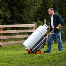Sack truck.Transform the Worx Aerocart into a sack truck in just a few simple steps and transport heavy items with ease. | Wheelbarrow.Unlike conventional wheelbarrows, the Aerocart is always stable thanks to its two wheels and does not tend to tip. Thanks to the solid rubber tyres, broken tyres are a thing of the past. | Cylinder holder.Worx Aerocart includes the practical cylinder holder. Whether you transport a gas bottle or other cylindrical objects – so they lie properly at the top and can even be lashed down. | Trailer puller.Thanks to the integrated coupling plug, you can also easily and easily move your trailer with the Worx Aerocart. Simply hang the aerocart into the towing hitch and off you go! |