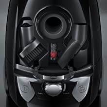 The main body has a large silver suction control knob which allows fine control depending on the surface being cleaned. No more fighting disappearing cushions and curtains! This is very useful when doing delicate items.