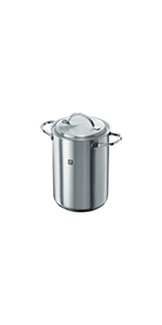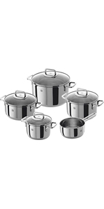 3x cooking pot (Ø 16 cm/2 L, Ø 20 cm/4 L, Ø 24 cm/7 L), 1x roasting pot (Ø 20 cm/3 L), 1x saucepan (Ø 16 cm/1.5 L) 3-layer sandwich base with strong aluminium core
