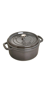 Round cocotte for frying, slow cooking and stylish serving, With special drop structure in the lid, suitable for induction