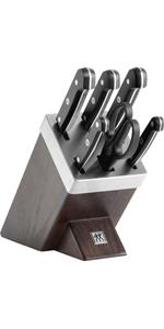 Self-sharpening knife block with slicing knife, utility knife, chef’s knife, bread knife, paring knife and multi-purpose scissors