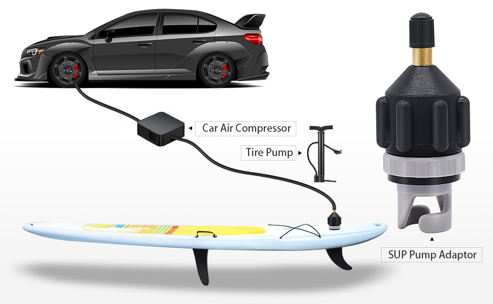 I like these, now when I go down the beach or lake I can use my electric car pump to pump up our SUP boards, gave one of these ago today just to see if it worked and no problems, it fits the SUP board valve nicely and then it’s just a case of setting the pressure on my pump turning it on then sitting back watching it inflate no effort required, with two of these I can keep one in each of the SUP board bags.