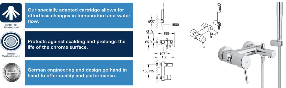 Great bath filler/Shower tap, there aren’t many premium concealed mixer taps that both have filler faucet and shower outlet. It is heavy with high shine chrome plating, it has 150mm standard hot and cold inlet distance but comes with Grohe fixing which is not suitable if you are replacing standard thermostatic shower mixer which you need to buy bar shower fixing kit or use your old one.