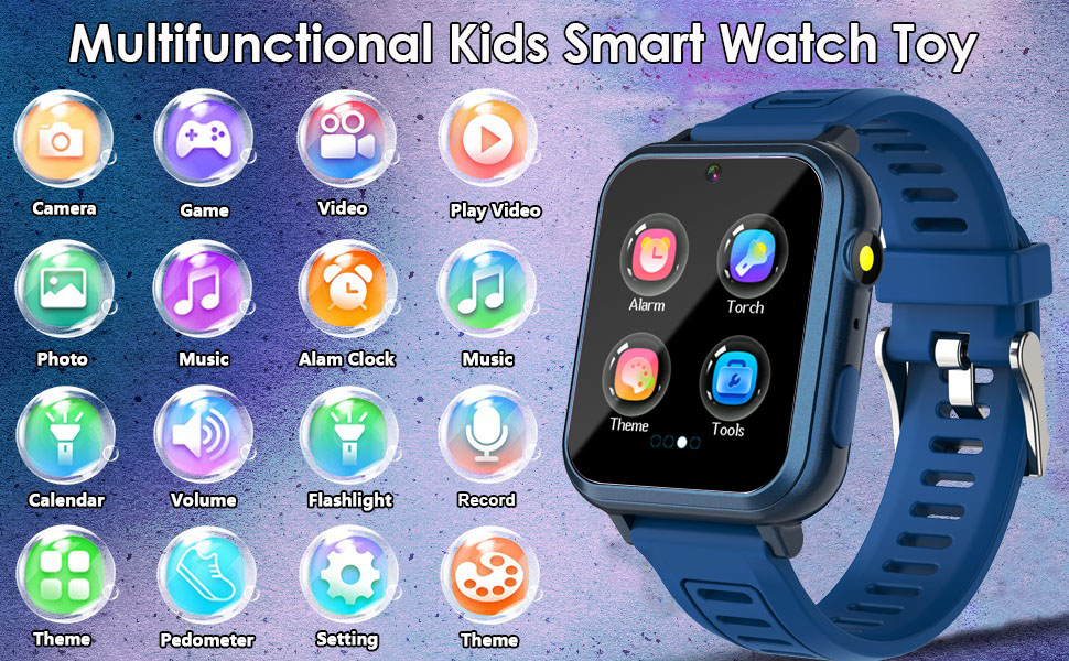 This smart watch is in fact perfect for kids which ncludes many useful and funny functions:, ie, 16 games, take pictures, videos, music players, step counter, alarm, calculator, calendar, flashlight, five languages, 12/24h format, wall paper, etc. Easy to operate for kids, and ideal gift for 3-14 years old boys and girls on especial occasions like birthday or holiday.