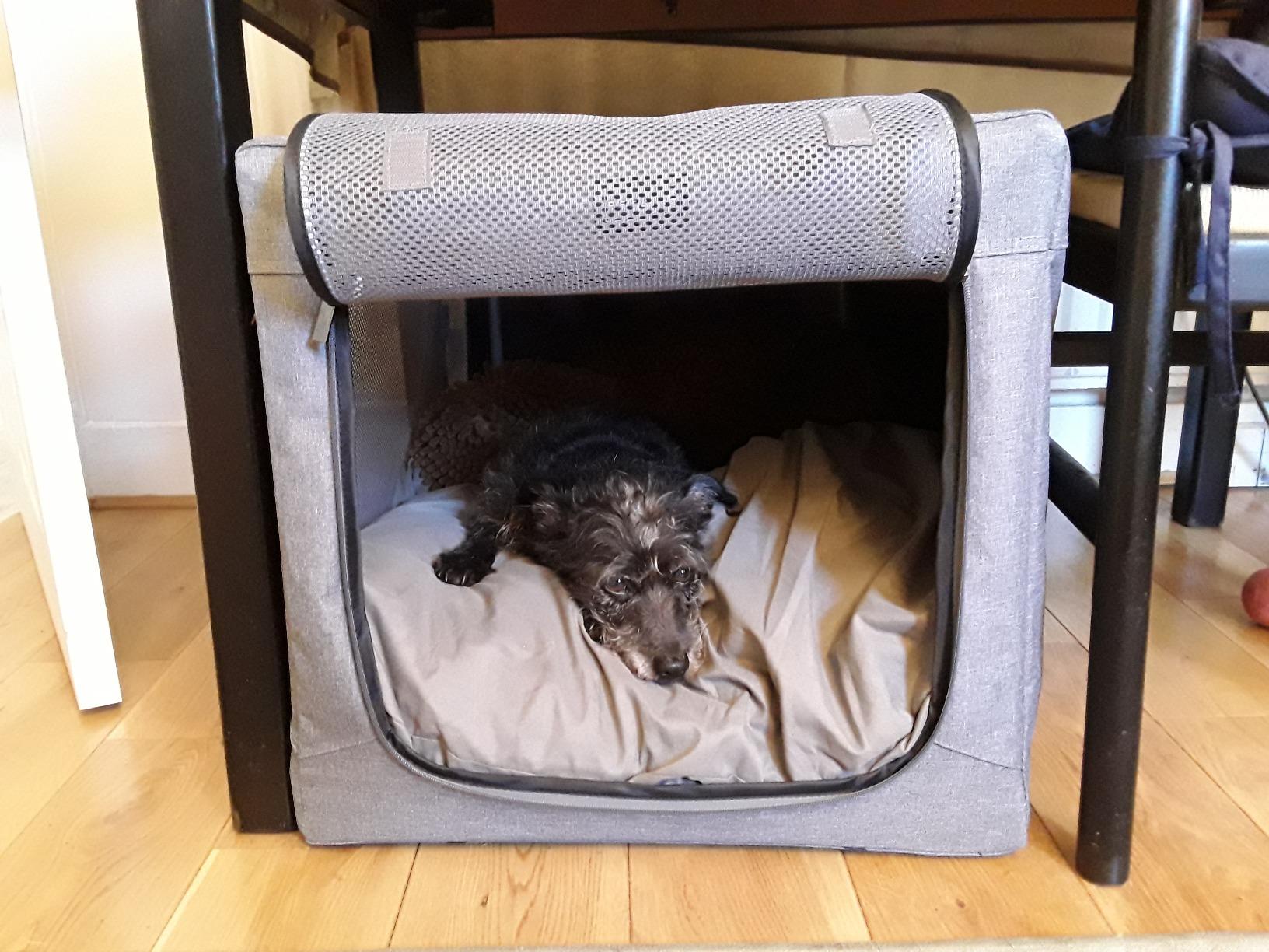 Seems a really nice place for the dog to be in, popped a fluffy blanket in there and she loves it, far happier than the horrible metal cages. Sadly mine split on the seam of the zipper, have sent it back but am going to get another and hopefully mine was just a weak join on the zipper. Update after a few months, hasn’t ripped this one so can happily recommend it 🙂